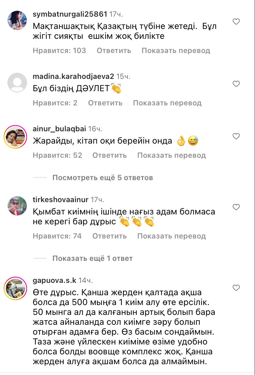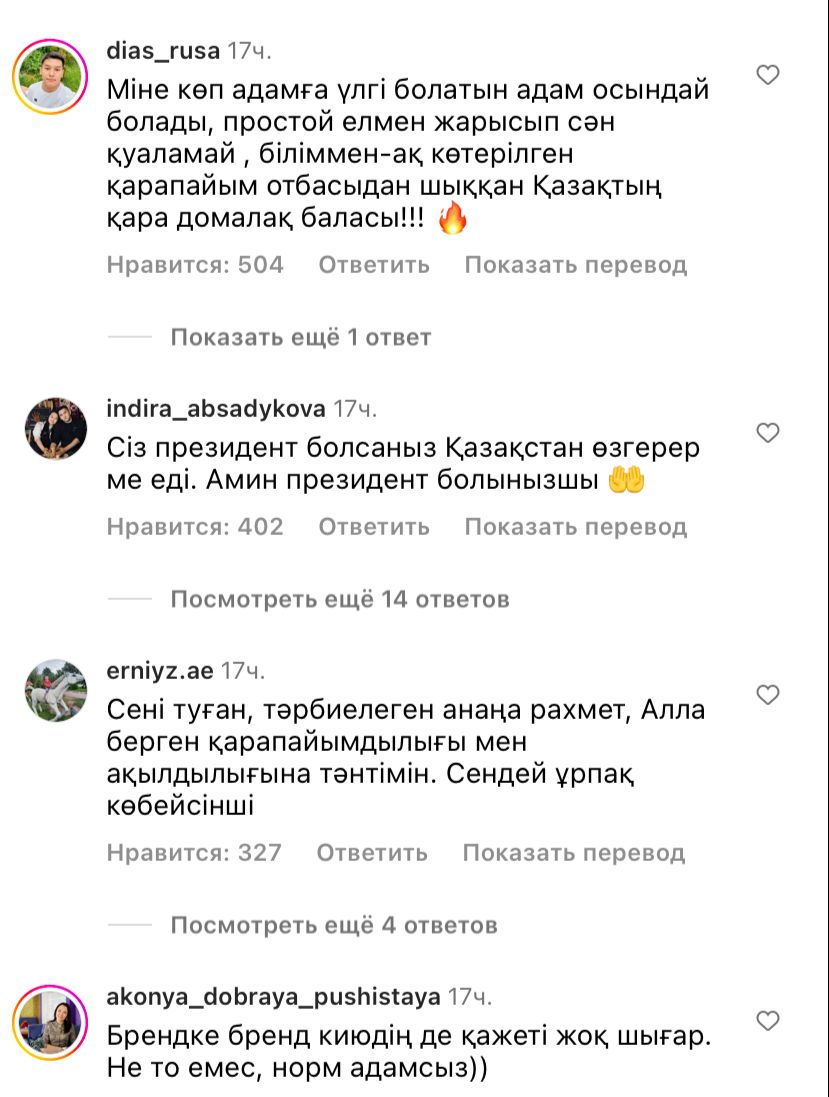"Сіз президент болсаңыз Қазақстан өзгерер ме еді? Амин президент болыңызшы", "Брендке бренд киюдің де қажеті жоқ шығар. Не то емес, норм адамсыз", " Сені туған анаңа рахмет, Алла берген қарапайымдылығы мен ақылдылығына тәнтімін. Сендей ұрпақ көбейсінші", — деп жазды олар.