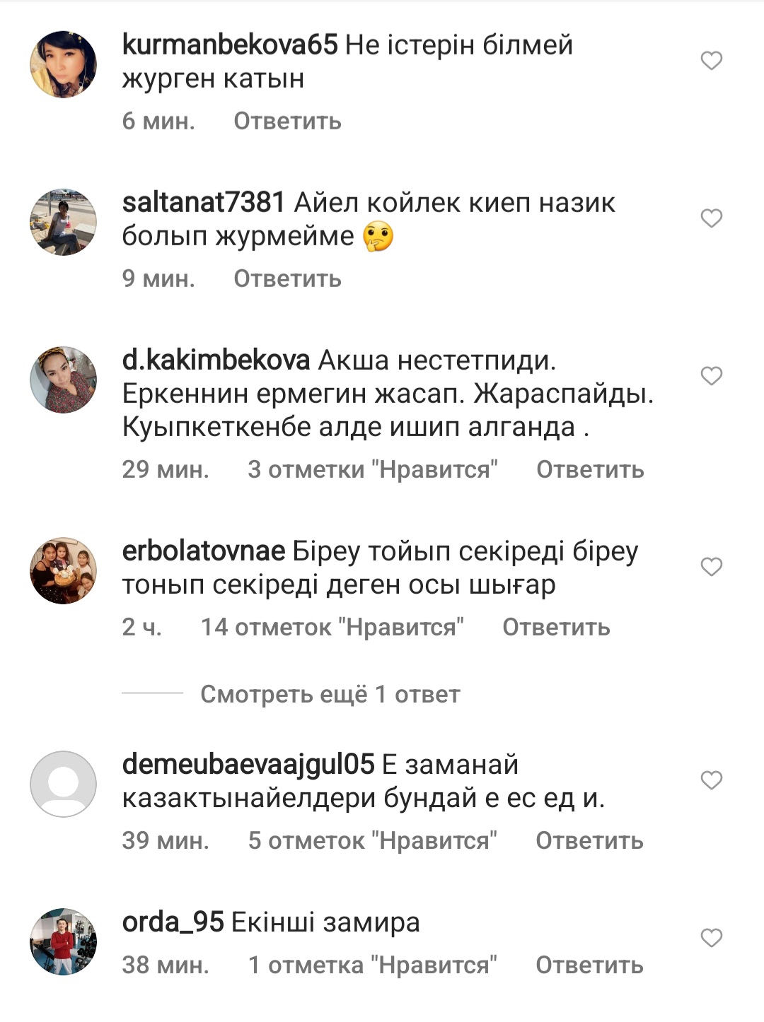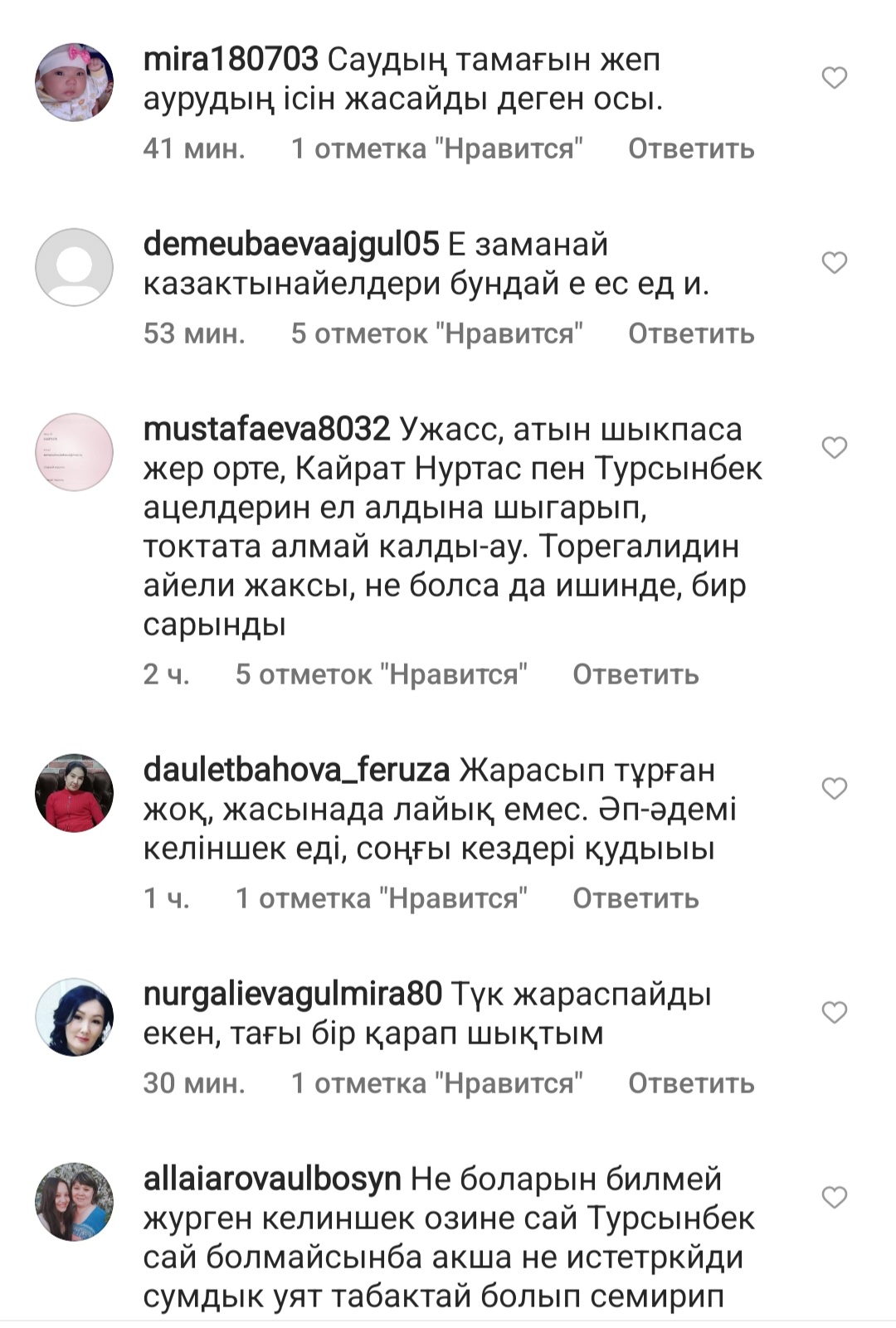 "Қайрат Нұртас пен Тұрсынбек әйелдерін ел алдына шығарып тоқтата алмай қалды", "Не істерін білмей жүрген қатын", "Әйел көйлек киіп, нәзік болып жүрмей ме", "Ее, заман-ай, қазақтың әйелдері мұндай емес еді", "Екінші Замира", деп ерсі әрекет екенін жазды оқырмандар.