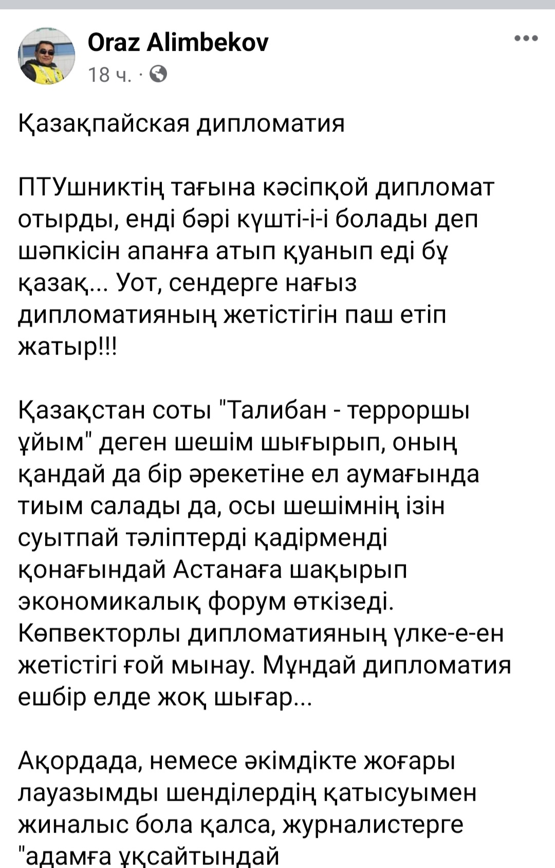 "Қазақстан соты "Талибан — терроршы ұйым" деген шешім шығырып, оның қандай да бір әрекетіне ел аумағында тиым салады да, осы шешімнің ізін суытпай тәліптерді қадірменді қонағындай Астанаға шақырып экономикалық форум өткізеді. Көпвекторлы дипломатияның үлке-е-ен жетістігі ғой мынау. Мұндай дипломатия ешбір елде жоқ шығар…