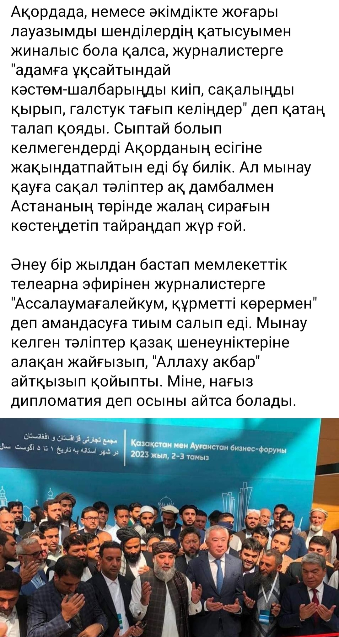 Әнеу бір жылдан бастап мемлекеттік телеарна эфирінен журналистерге "Ассалаумағалейкум, құрметті көрермен" деп амандасуға тиым салып еді. Мынау келген тәліптер қазақ шенеуніктеріне алақан жайғызып, "Аллаху акбар" айтқызып қойыпты. Міне, нағыз дипломатия деп осыны айтса болады", деп жазды.