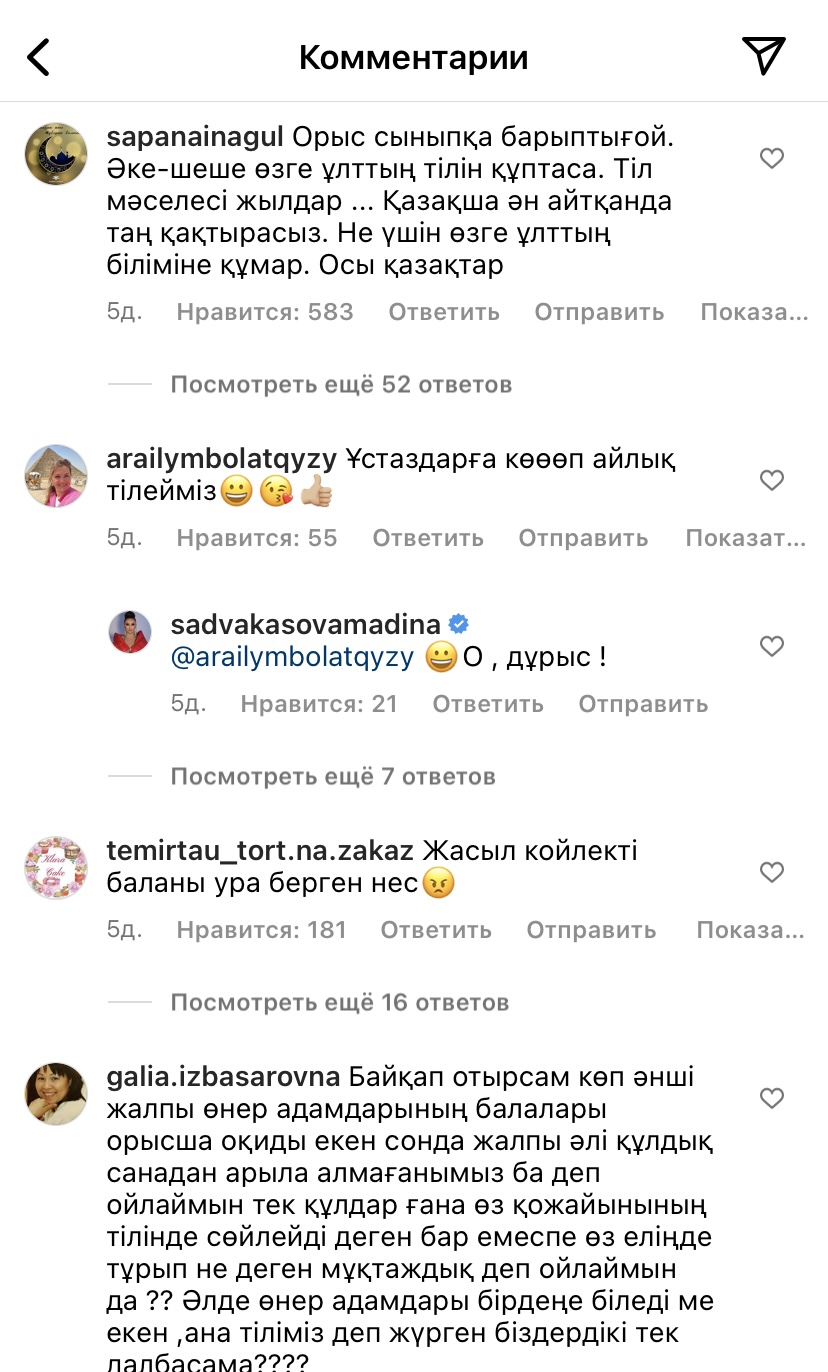 Әнші Мадина Сәдуақасова ұлын орыс сыныбына бергені үшін қатаң сынға ұшырады.