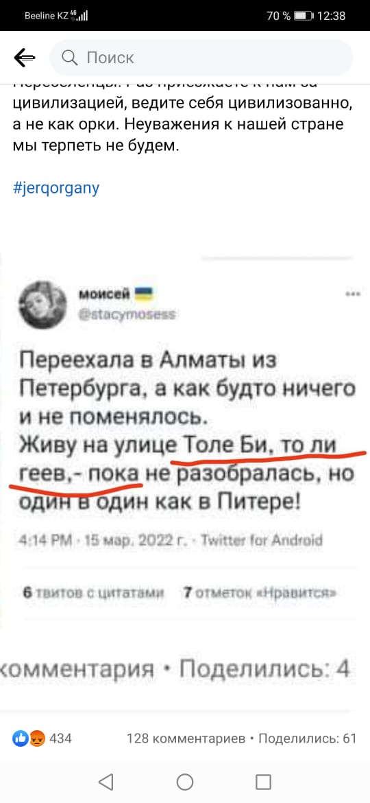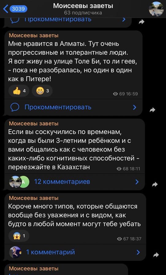 "Алматыға Петербургтен көшіп келдім. Ештеңеге өзгермегендей. Төле би ма геев па, қандай көшеде тұратынымды әлі анықтап үлгермедім. Бірақ дәлме дәл Питердегідей екен", "3 жасар бала болған кезіңізді сағынсаңыз, сізге танымдық қабілеті жоқ адам сияқыт десеңіз Қазақстанға көшіп келіңіздер", "Сенімен құрметсіз сөйлесетіндер көп екен. Сені кез келген уақытта өлтіріп тастайындай болып көрінеді", — деп жазған Қазақстанға қашып келген ресейліктер.
