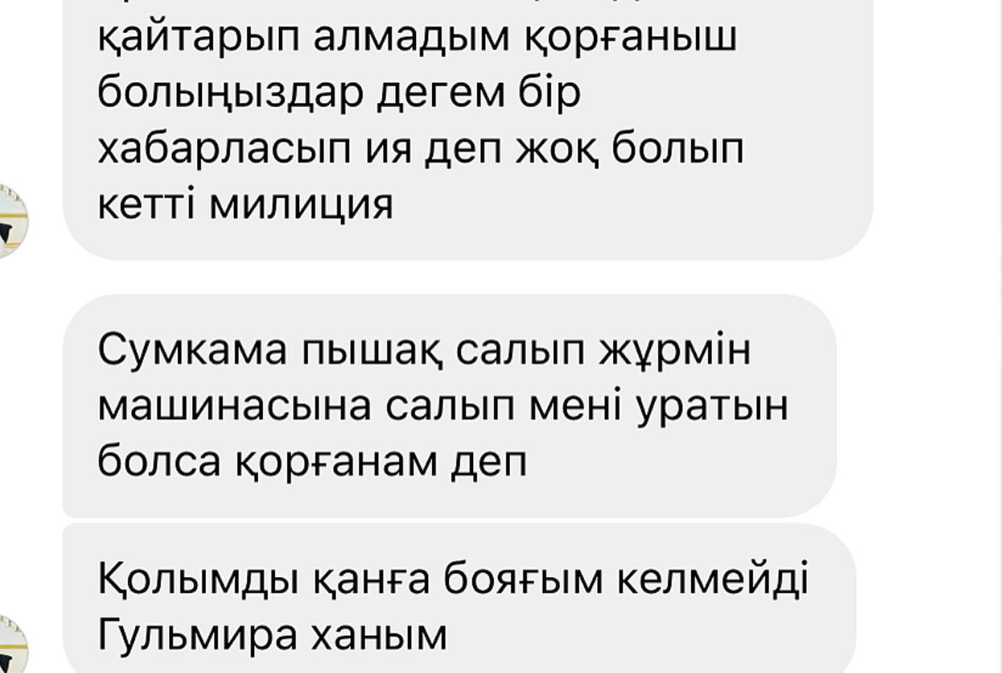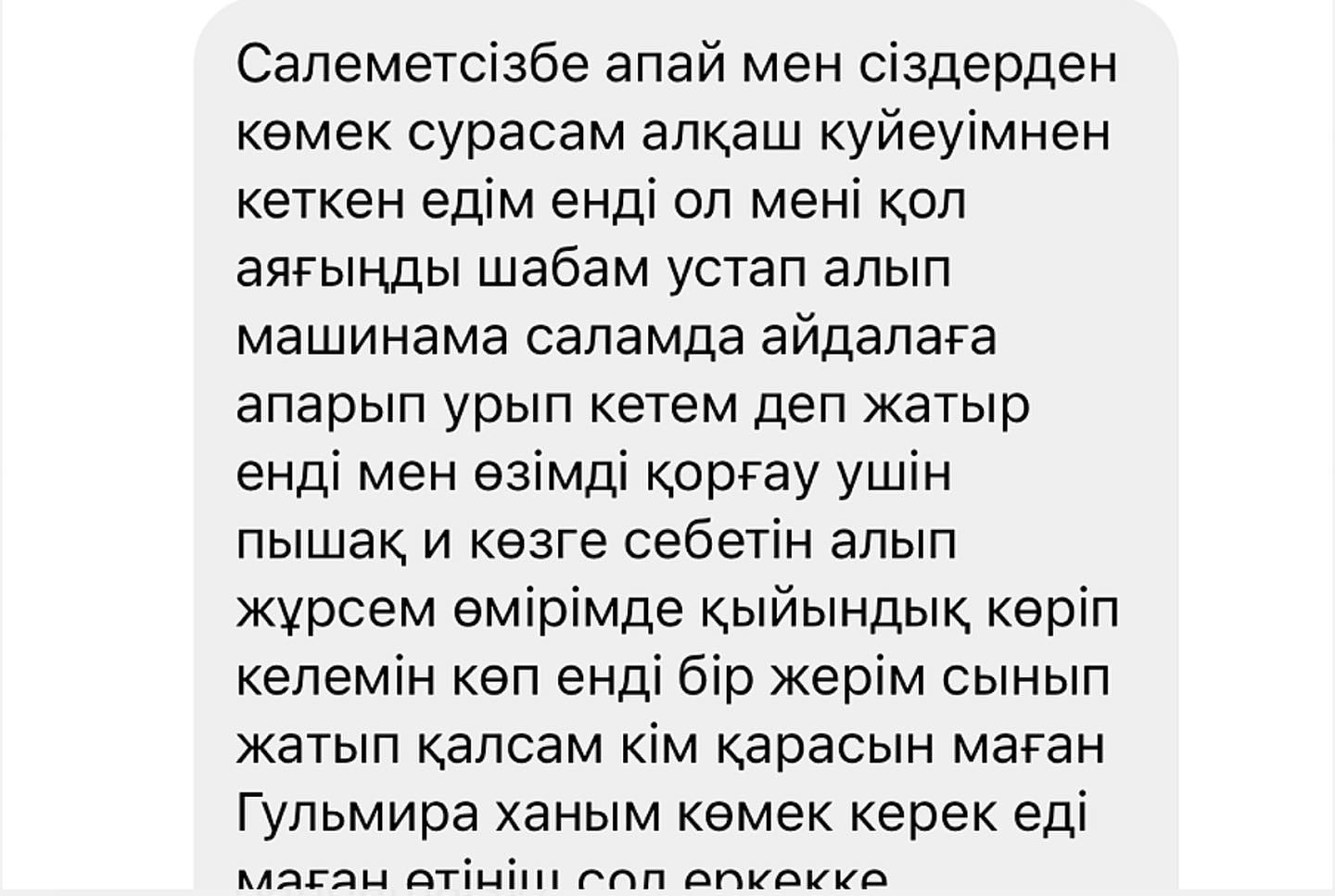 "Салеметсіз бе апай, мен сіздерден көмек сұрасам алқаш күйеуімнен кеткен едім, енді ол мені қол-аяғыңды шабам, ұстап алып машинама салам да айдалаға апарып ұрып кетем деп жатыр. Енді мен өзімді қорғау үшін пышақ және көзге себетін алып жүрсем өмірімде қыйындық көріп келемін көп, енді бір жерім сынып жатып қалсам кім қарасын маған? Гүлмира ханым көмек керек еді маған, өтініш сол еркекке психолог керек маған да керек