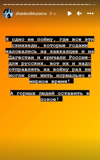 "Жылдар бойы кавказдарға арызданып, Ресей ол орыстар үшін дегендер қайда? Дәл соларды соғысқа жіберу керек. Бейбіт уақытта дұрыс өмір сүре алмады ғой, солар барсын. Ал таулы адамдарды жайларына қойыңдар", — деп жазды Жанқош Тұраров.