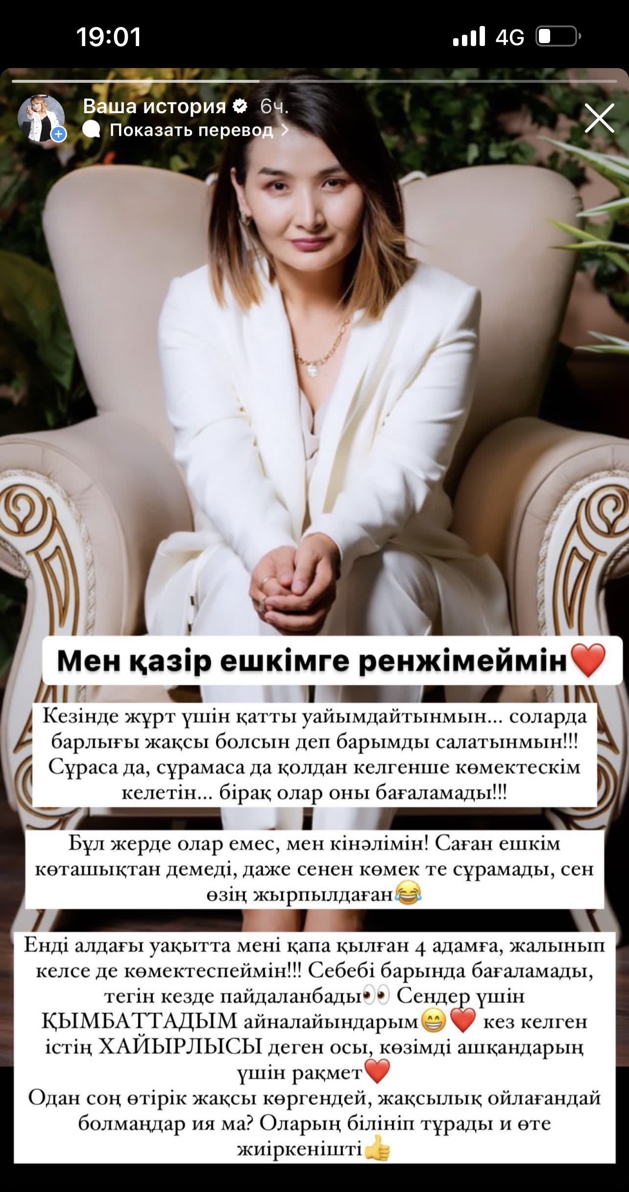 Енді алдағы уақытта мені қапа қылған 4 адамға жалынып келсе де көмектеспеймін. Себебі барында бағаламады. Тегін кезде пайдаланбады. Сендер үшін қымбаттадым айналайындар! Кез-келген істің хайыры болады деген осы. Көзімді ашқандарың үшін рахмет! Содан соң өтірік жақсы көргендей, жақсылық ойлағандай болмаңдаршы иә ма? Өте жиіркенішті көрінеді және білініп тұрады”, — деп жазды.