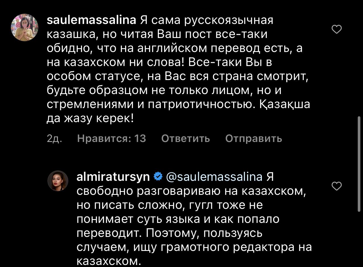 "Кейбір адамдар ұрсып сұраған. "Неге қазақтың қызы қазақша сөйлемейді? Қазақша жазбайды?" деп. Негізінде мен қазақша сөйлей аламын. Бірақ, жаза алмаймын. Себебі, мектепте оқығанда, университетте оқығанда орысша оқыдым", — дейді ол.