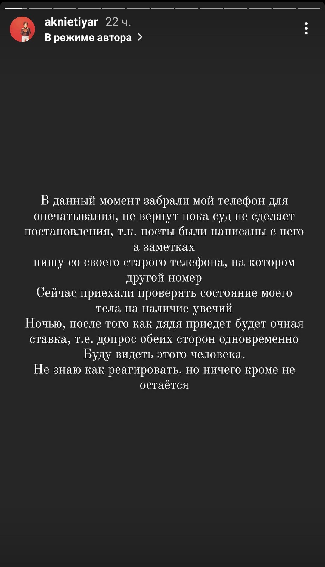 "Қазіргі уақытта менің телефонымды (саусақ іздерін) тексеруге алды. Оны соттың шешімінсіз қайтармайды, жазбалар сол жерде болатын. Дәл қазір басқа нөмірлі ескі телефонмен жазып отырмын.