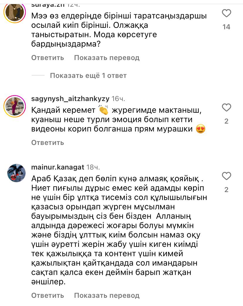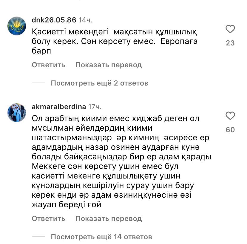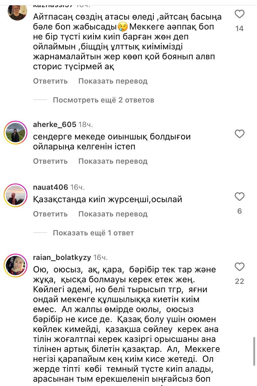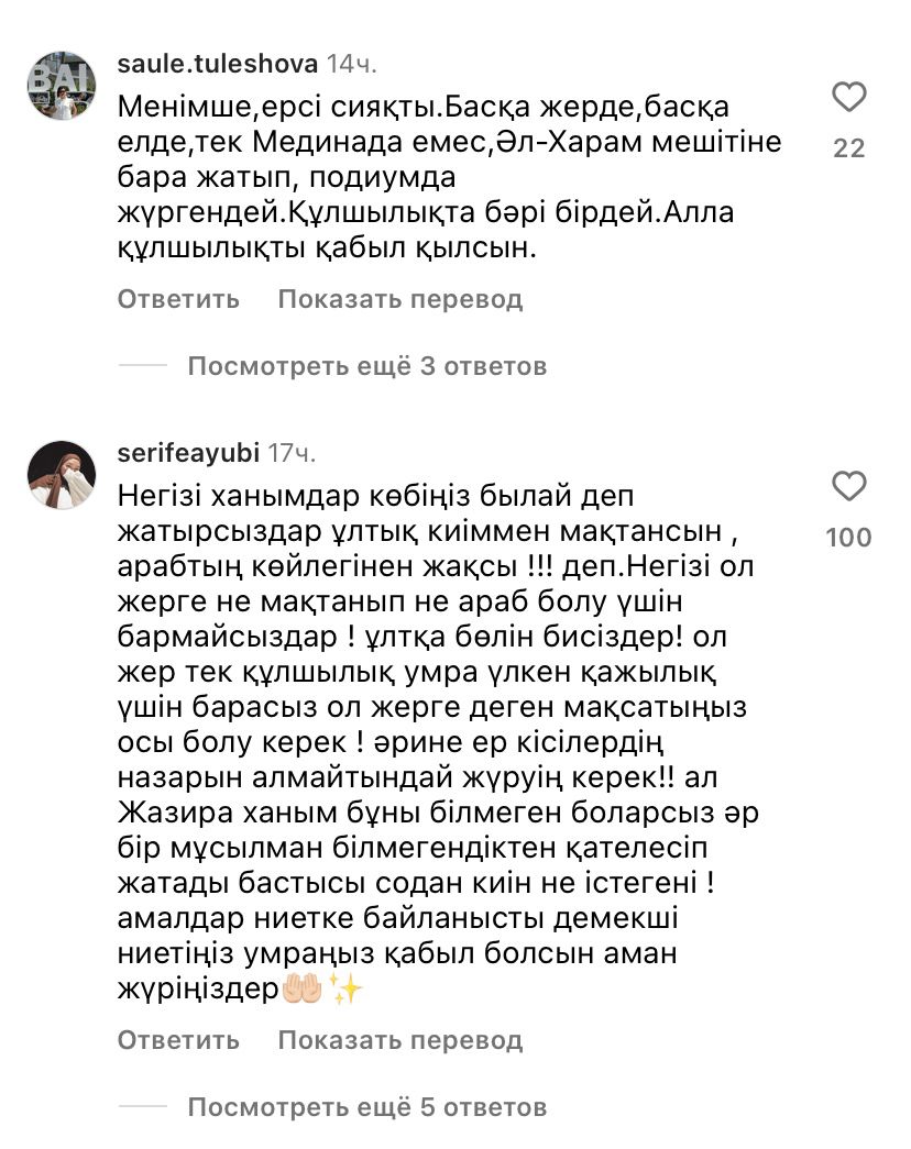 "Қасиетті мекенде олай назар аудартуға болмайды, егер дін жолын тереңірек білсеңдер", "Меніңше, ерсі сияқты, подиумда жүргендей", "Өз елдеріңде таратсаңдаршы бірінші осылай, мода көрсетуге бардың ба", "Қасиетті мекендегі мақсатың құлшылық болсын, сән көрсету емес", "Сендерге Мекке де ойыншық болды ғой, ойыларыңа келгенді істеп", — деп жазды олар.