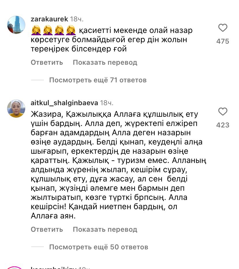 "Қазағымның ұлттық құндылықтары жоғалмаса екен деп тіледім. Қасиетті мекенде ұлттық киім киюдегі мақсатым да осы еді", — деп жазды әнші.