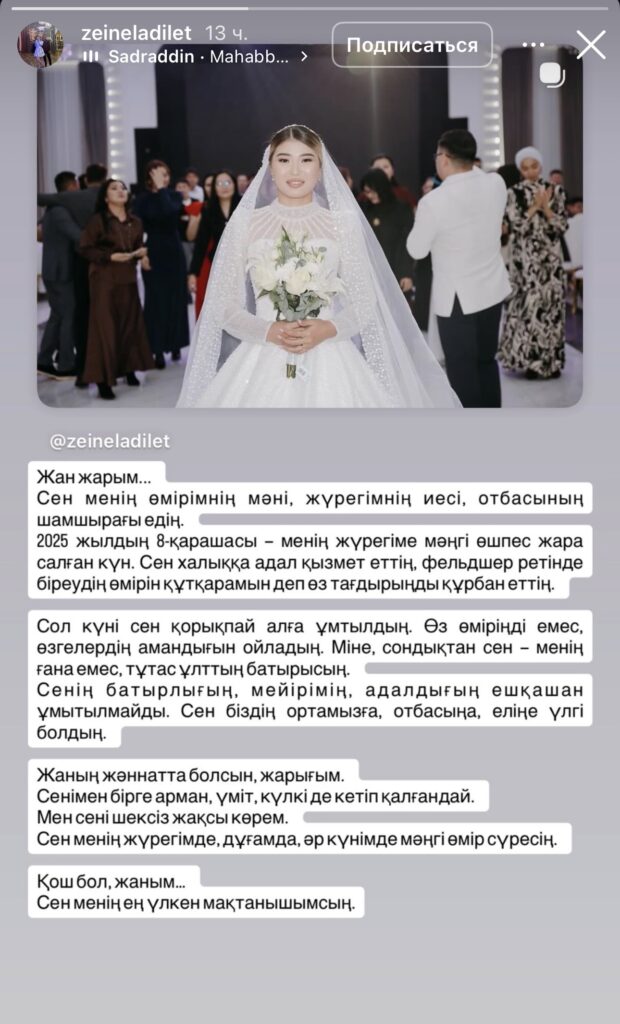 ”Жан жарым! Сен менің өмірімнің мәні, жүрегімнің иесі, отбасымның шамшырағы едің. 2025 жылдың 8 қарашасы — менің жүрегіме мәңгі өшпес жара салған күн. Сен халыққа адал қызмет еттің, фельдшер ретінде біреудің өмірін құтқарамын өз тағдырыңды құрбан еттің.