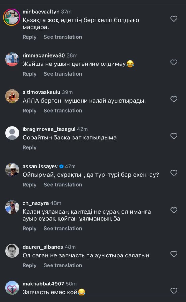 «Қазақта жоқ әдеттің бәрі келіп болды ғой, масқара», «Алла берген мүшені қалай ауыстырады», «Сұрайтын басқа нәрсе қалмады ма», «Өте нашар сұраққа қандай керемет жауап», «Сұрағын дұрыс жеткізе алмаған сияқты. Түбегейлі ауыстыру емес, өзгерту дегесі келген сияқты. Қазір үлкейтетін, ұзартатын неше түрлісі бар ғой», — деп жазды олар.