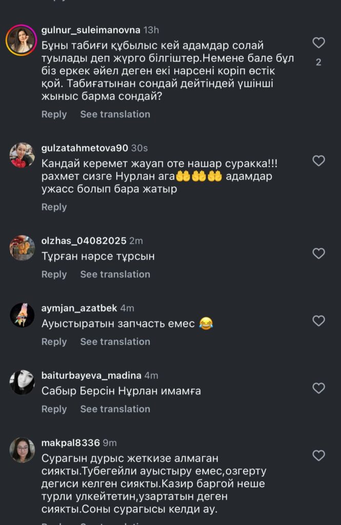 «Ол ауыстыратын автобөлшек емес қой. Камаз камаз болып, танк танк болып, трактор трактор болып қалуы керек. Велосипед ешқашан трактор бола алмайды. Тура сол сияқты әр нәрсе өз орнында қалу керек. Алла тағала еркек қылып жаратты ма, еркек болып қалу керек. Қазір заман ауысып, адамдар өзгеріп жатыр. Егер ауыстыратын болса, ми ауыстырған дұрысырақ, жеңілірек болатын шығар. Сана берсін. Біздің қазаққа мұндай дүние келмейді деп едік. Бара-бара біздің де етіміз үйреніп бара жатыр. Негізі жақсы нәрсе емес, харам. Тиіспеу керек, тұрған нәрсе тұрсын», — деді имам.