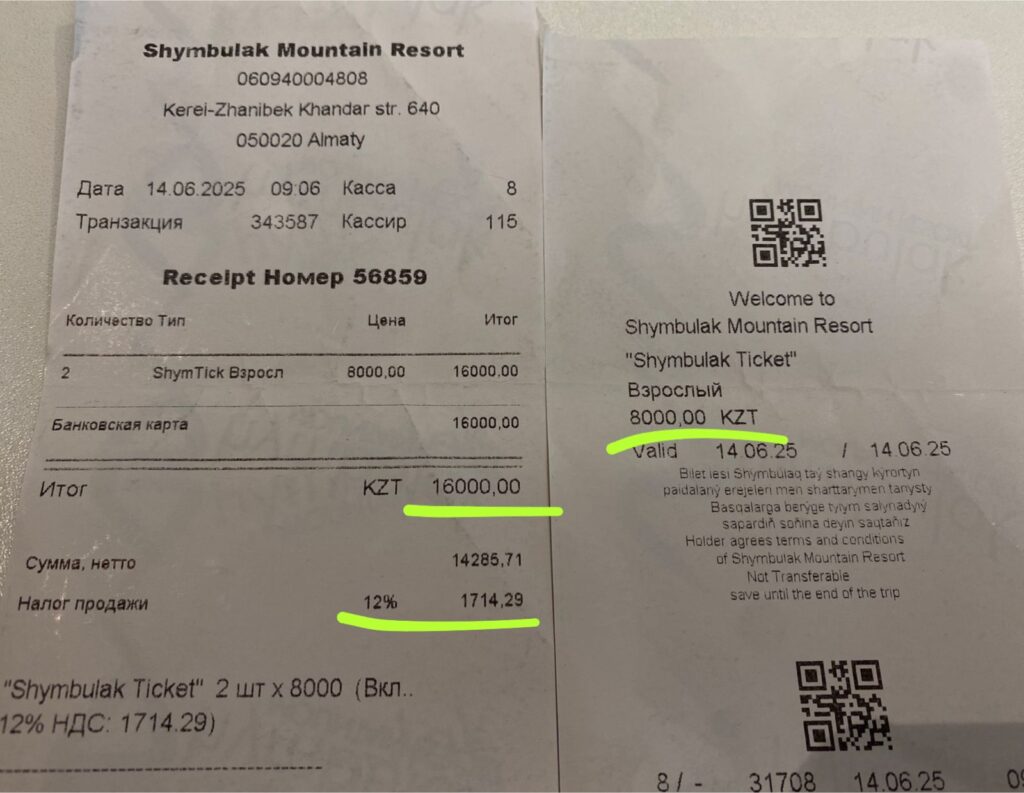 Арқан жолының бағасы қымбатшылықтың айқын көрінісі. Өткен жылы ең биік нүктесіне дейін көтерілу құны бір адамға 8 мың теңге болған. Ол кезде қосылған құн салығы 12 пайыз еді. Сaravan.kz тілшісі қазіргі бағаны білу үшін арнайы Шымбұлаққа келді. ҚҚС 16%-ға өскелі, көтерілу құны бір адамға 10 мың теңгеге өскен. Яғни 2000 теңгеге қымбаттаған.