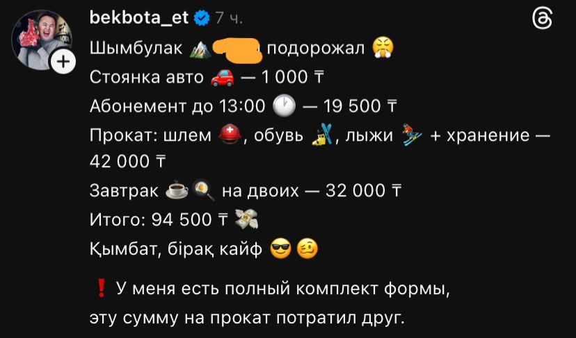 Бұл шығындардың бір бөлігі ғана. Келушілердің есебіне сүйенейік. Көлікті тұраққа қою – 1000 теңге, түскі сағат 13:00-ге дейінгі абонемент – 19 500 теңге, жабдықты жалға алу (каска, аяқ киім, шаңғы, сақтау қызметі) – 42 мың теңге, екі адамға арналған таңғы ас – 32 мың теңге. Нәтижесінде Шымбұлақта жарты күн демалу үшін орта есеппен 95–100 мың теңге қаражат жұмсалады. Минималды жалақы алатын, несиесі бар немесе көпбалалы отбасылар үшін бұл мүмкін емес.