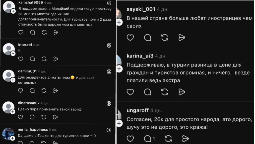 «Мұны міндетті түрде жасау керек. 26 мың теңге өте қымбат. Басқа елдерде жергілікті тұрғындар мен шетелдіктерге арналған тариф бірнеше есе айырмашылықпен белгіленеді. Қазақстан азаматтары үшін баға 15-16 мың теңге болуы керек, ал шетелдіктер үшін 50 мың теңгеден басталуы тиіс».