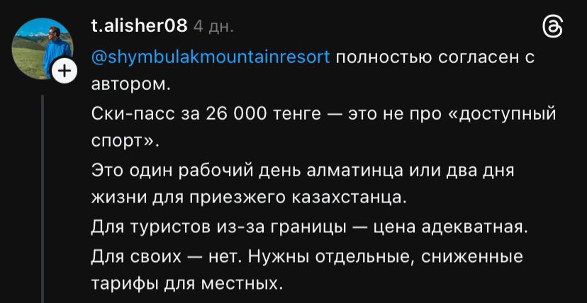 «26 мың теңгелік ски-пасс жергілікті тұрғындар үшін қолжетімсіз, ал шетелдік туристер үшін бұл қалыпты баға», – дейді халық.