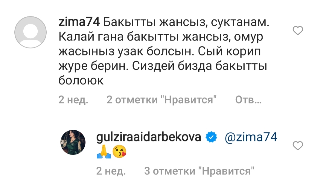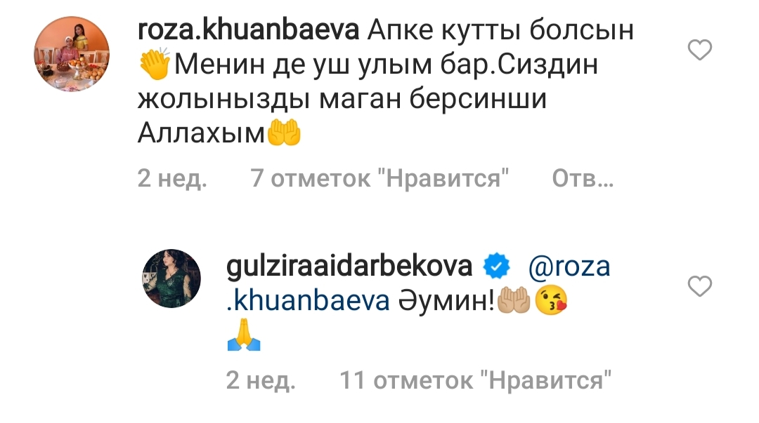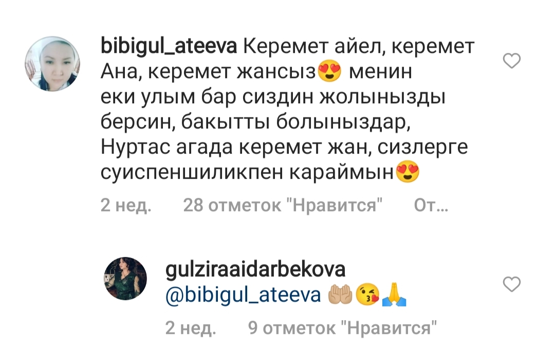 "Керемет әйел, керемет Ана, керемет жансыз. Менің екі ұлым бар. Сіздің жолыңызды берсін! Нұртас аға да керемет жан. Сіздерге сүйіспеншілікпен қараймын", "Құтты болсын, сіздердің жолдарыңызды бізге берсін. Жұғысты болсын. Немерем Қайраттай әнші, абыройлы болса екен", "Апке құтты болсын. Менің де үш ұлым бар. Сіздің жолыңызды маған берсінші Аллахым!, "Өркеніңіз өсе берсін, барлық елге әйгілі боп жүре беріңіздер", "Бақытты жансыз, суктанам. Қалай ғана бақытты жансыз, омур жасыныз узак болсын. Сый корип журе берин. Сиздей бизда бакытты болайык,", деп сүйсіне де, тамсана қарап, өздеріне Гүлзира ханымның жолын тілейтін оқырмандар көптеп табылады.
