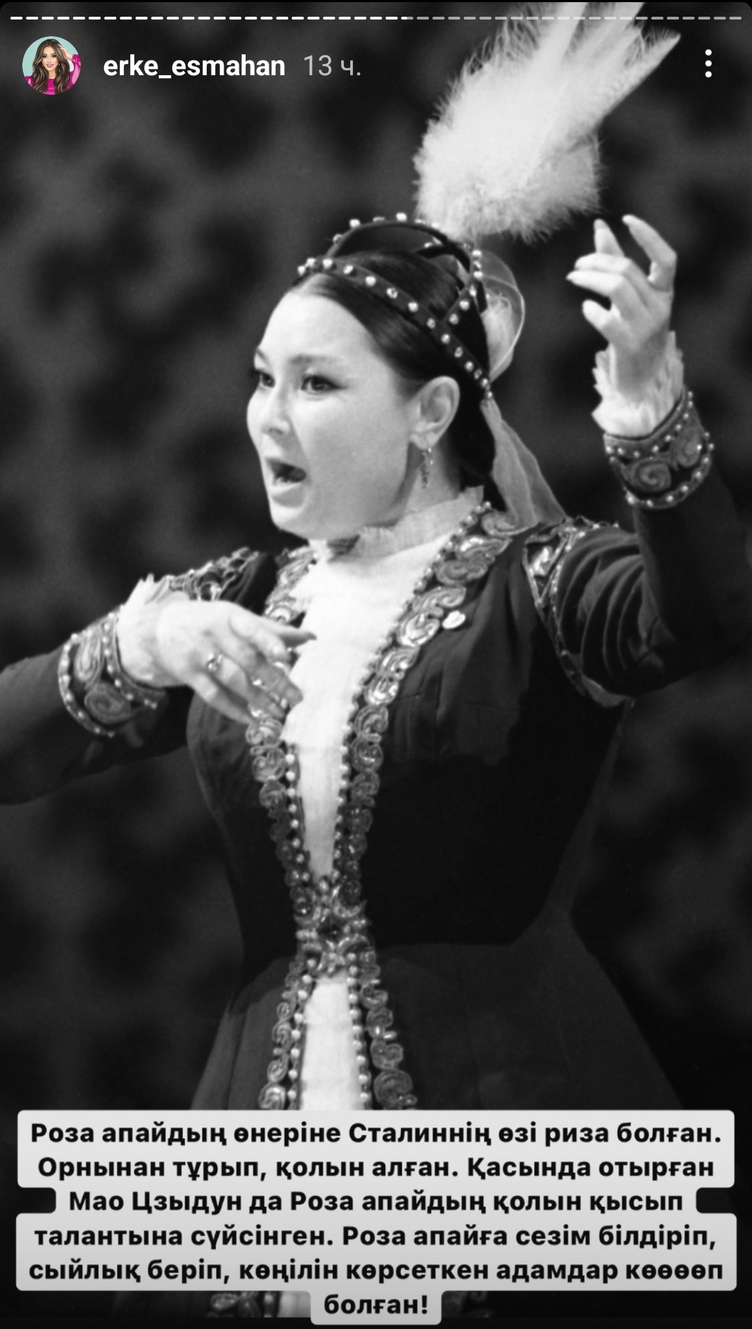 "Роза Бағланованың өнеріне Сталиннің өзі риза болған. Орнынан тұрып, қолын алған. Қасында отырған Мао Цзыдун да Роза Бағлановаға сезімін білдіріп, сыйлық беріп, көңілін көрсеткен адамдар көп болған. Олардың қатарында Сталин, Брежнев, Хрущев, Джавахарлал Неру, Ким Ир Сен, Мао Цзыдун, Шәкен Айманов, Мұхтар Әуезов, Бауыржын Момышұлы, Жұбан Молдағалиев, Талғат Бегилдинов, Мұхтар Шаханов сияқты мықтылар болған. Оған замандас ер азаматтардың бәрі дерлік ғашық еді. Біразымен кездесіп, көңіл қосқан деседі!" деп жазды Ерке Есмахан иснтаграмдағы сторис бөлімінде.