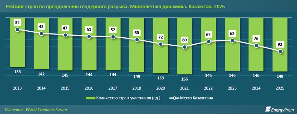 Осылайша, 2013 жылдан 2025 жылға дейінгі аралықта Қазақстан әлемдік рейтингте 60 позицияға төмендеді. Демек, ел ішіндегі жағдай мәз емес, гендерлік алшақтықтың күшейгенін көрсетіп отыр, ал екінші жағынан басқа елдердің экономикалары бұл бағытта әлдеқайда жылдам ілгерілегенін аңғартады».