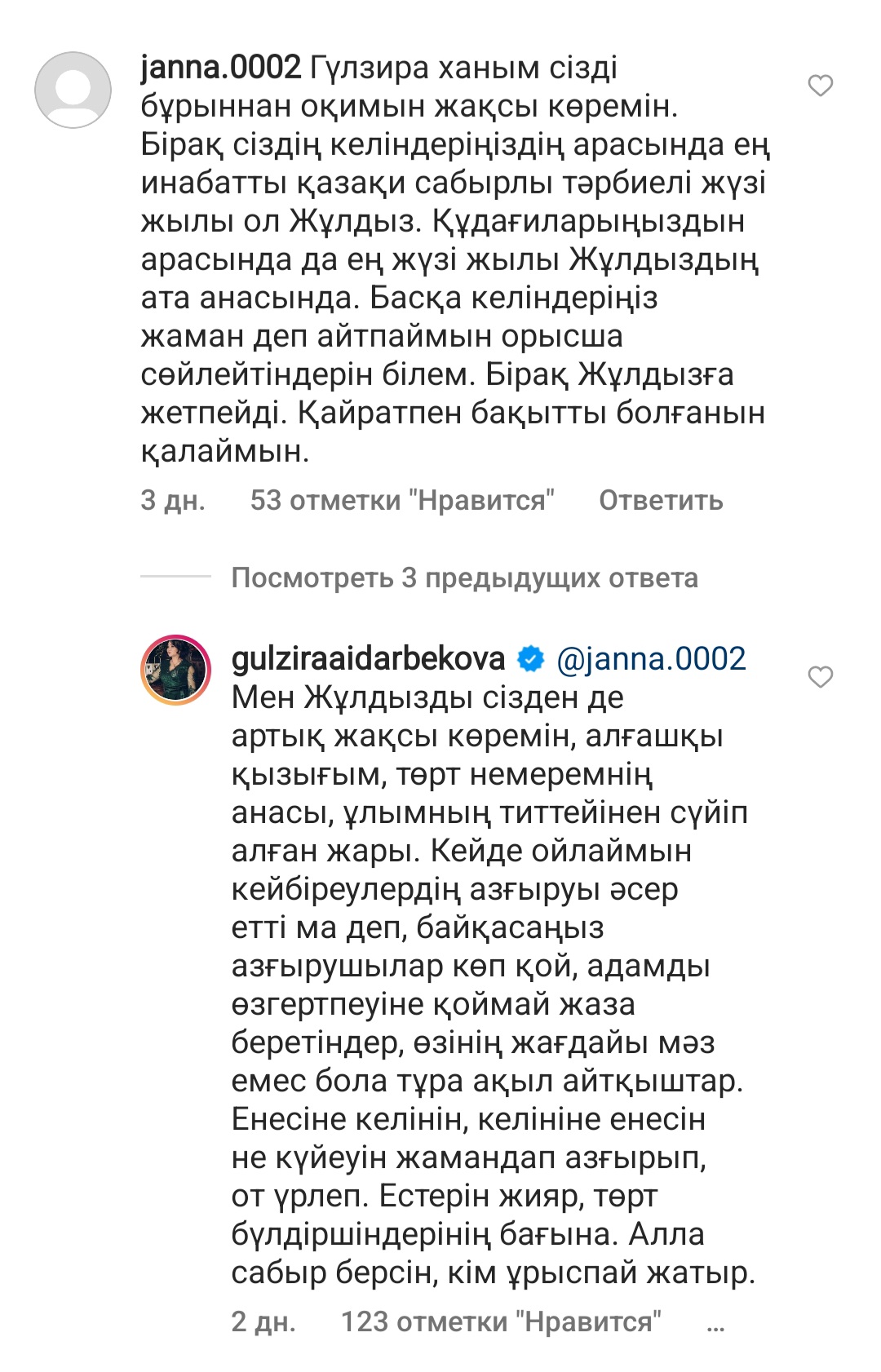 "Гүлзира ханым сізді бұрыннан оқимын, жақсы көремін. Бірақ, сіздің келіндеріңіздің арасында ең инабатты қазақи сабырлы тәрбиелі жүзі жылы ол Жұлдыз. Құдағиларыңыздын арасында да ең жүзі жылы Жұлдыздың ата-анасында. Басқа келіндеріңіз жаман деп айтпаймын орысша сөйлейтіндерін білем. Бірақ Жұлдызға жетпейді. Қайратпен бақытты болғанын қалаймын", деп жазды продюсердің оқырманы.
