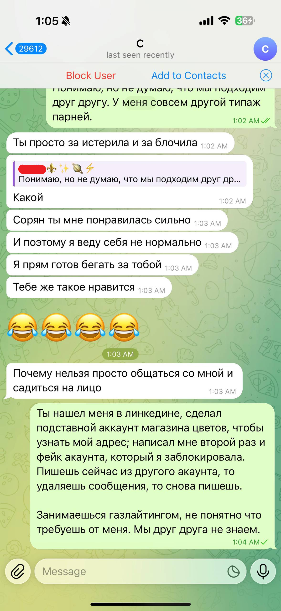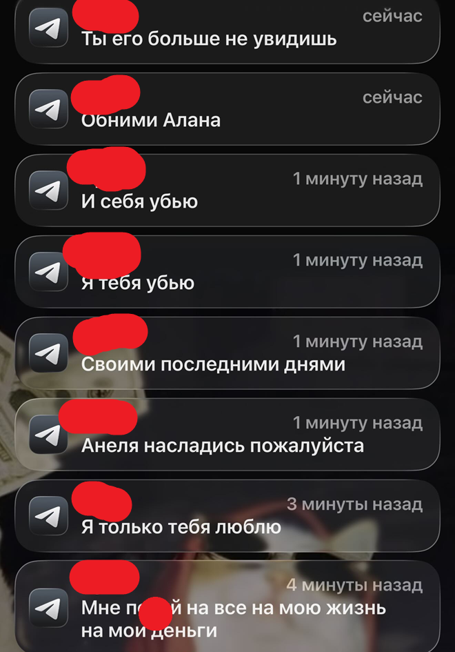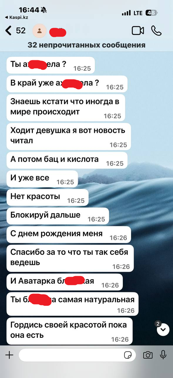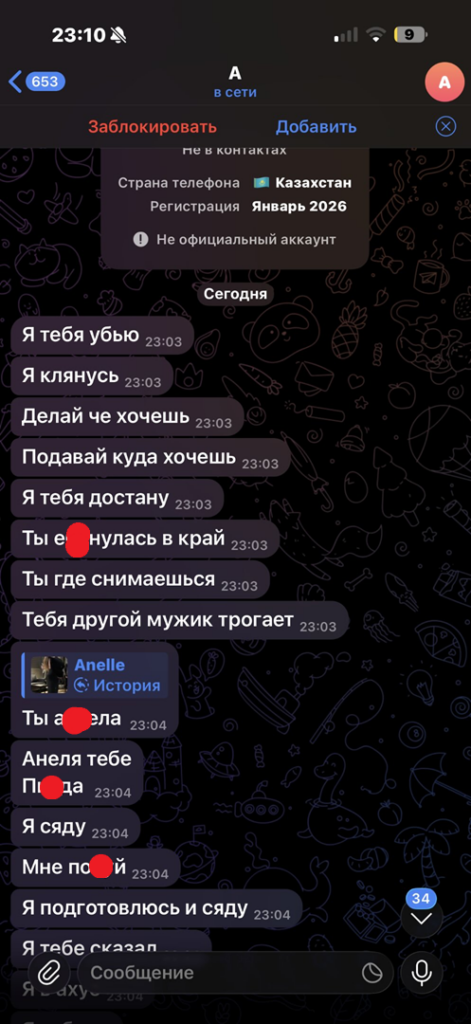 «Маған тағы бір жәбірленуші қыз жазды. Ол 2025 жылдың қарашасынан бері оны түрлі аккаунттар арқылы қудалағанын айтты. Ол да бәрін бұғаттаған, бірақ хабарламалар жаңа парақшалардан қайта келген. Оның рұқсатымен скриншоттарды жарияладым», — деп мәлімдеді Әнел.