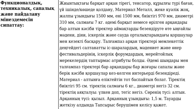 Техникалық сипаттамасы одан да қызық. Құжатта бұл тіректердің «мәдени, діни, іскерлік және сауда орталықтарында кезекті реттеу үшін», сондай-ақ «мемлекеттік деңгейдегі салтанатты іс-шараларда, мәдени фестивальдерде, форумдарда және мерейтойларда қолдануға» арналғаны жазылған.