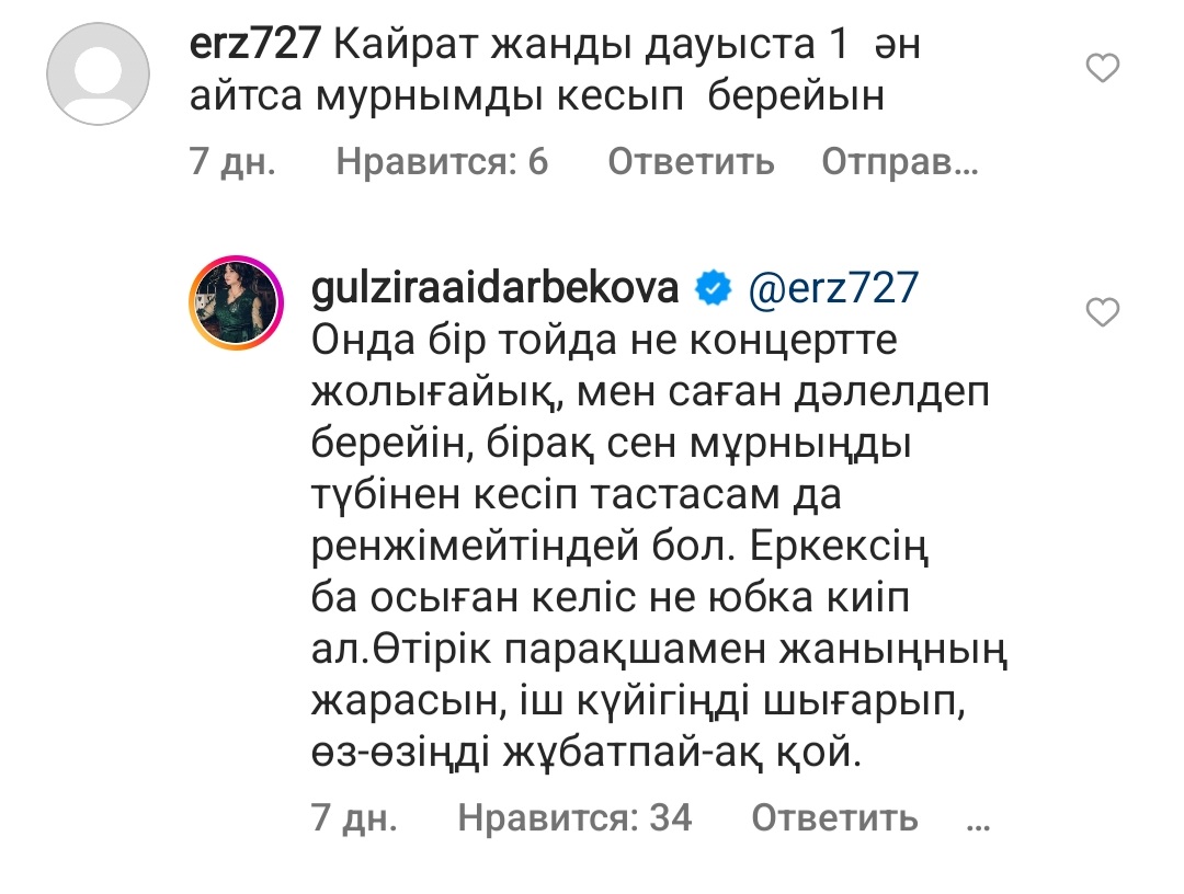 "Онда бір тойда, не концертте жолығайық. Мен саған дәлелдеп берейін. Бірақ, сен мұрныңды түбінен кесіп тастасам да ренжімейтіндей бол. Еркексің ба осыған келіс. Не болмаса юбка киіп ал. Өтірік парақшамен жаныңның жарасын, іш күйінішіғді шығарып, өз-өзіңді жұбатпай-ақ қой", деп өз жауабын жазды продюсер.