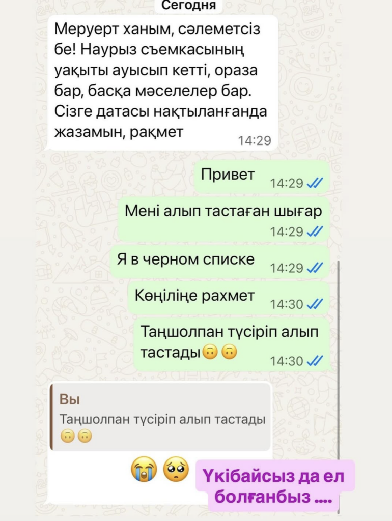 Бірақ, халқым-ау, шыдамның да шегі бар! Хабар Алматыдан шақыртып алып, ( #черныйсписок туралы білмегендер) 5 әнімді (видеолары бар) 8-9 оператор түсірді, қанша элекроэнергия, менің энергиямды (5-6 образ ауыстыру т.б ), қанша адамның еңбегі қанша уақыты. Содан, зым-зия жоқ, көрсетпеді. Одан, Таңшолпан түсірді жылдың аяғында, оны да бермеді…